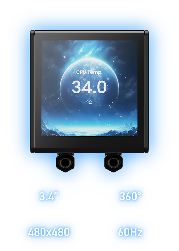The CHIONE P5-360 liquid cooler features a customizable 3.4″ IPS LCD display for real-time information, pictures and animated GIFs. Paired with a powerful 360mm radiator and three 120mm ARGB PWM fans, it delivers top-tier cooling performance, ensuring your system stays cool and fashion.