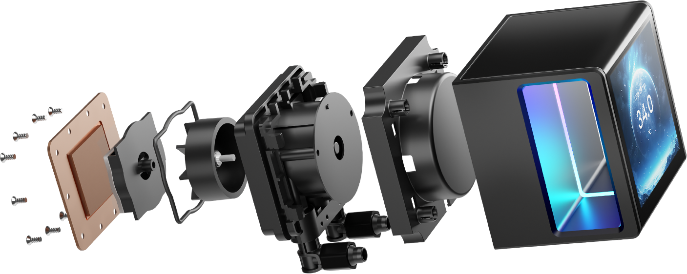 The optimized fluid routing system and 12-slot 10-pole motor ensure stable pump speed up to 2700 RPM and strong circulation in quiet operation to keep the copper base cool continuously.
