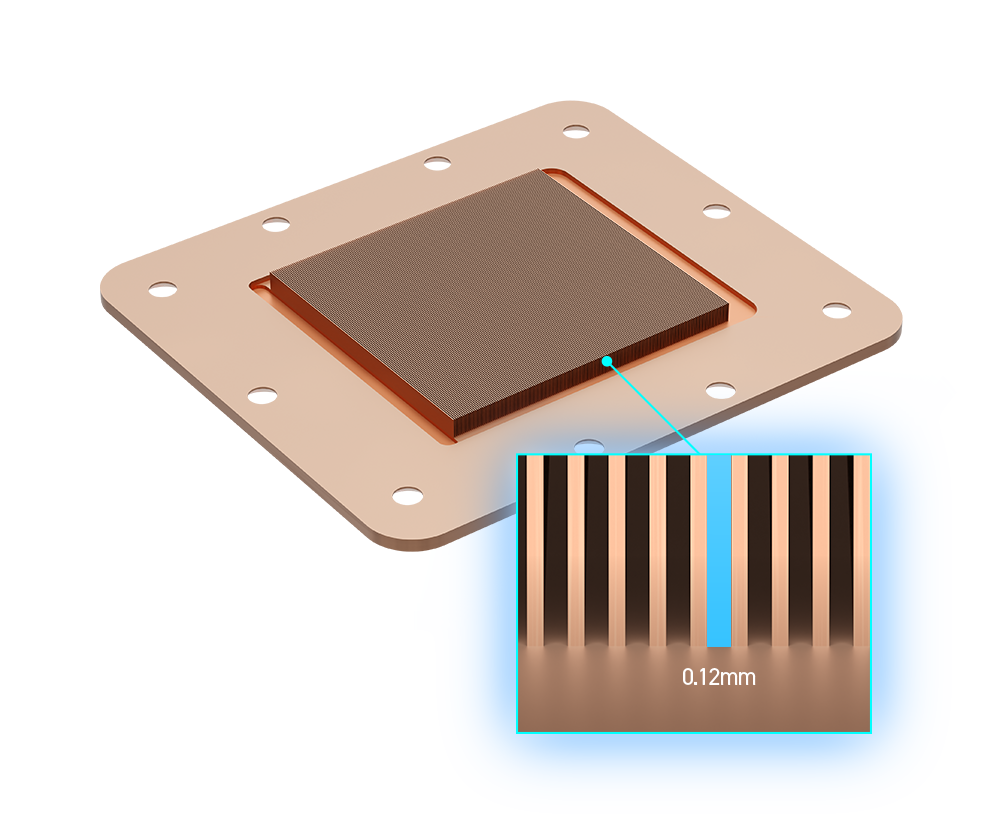 The CHIONE P5-360 features an upgraded coldplate optimized for improved heat dissipation, with 0.12mm microflow channels designed to maximize thermal transfer. The layout targets CPU hotspots, while a precision liquid splitter ensures efficient flow, boosting overall heat transfer performance.