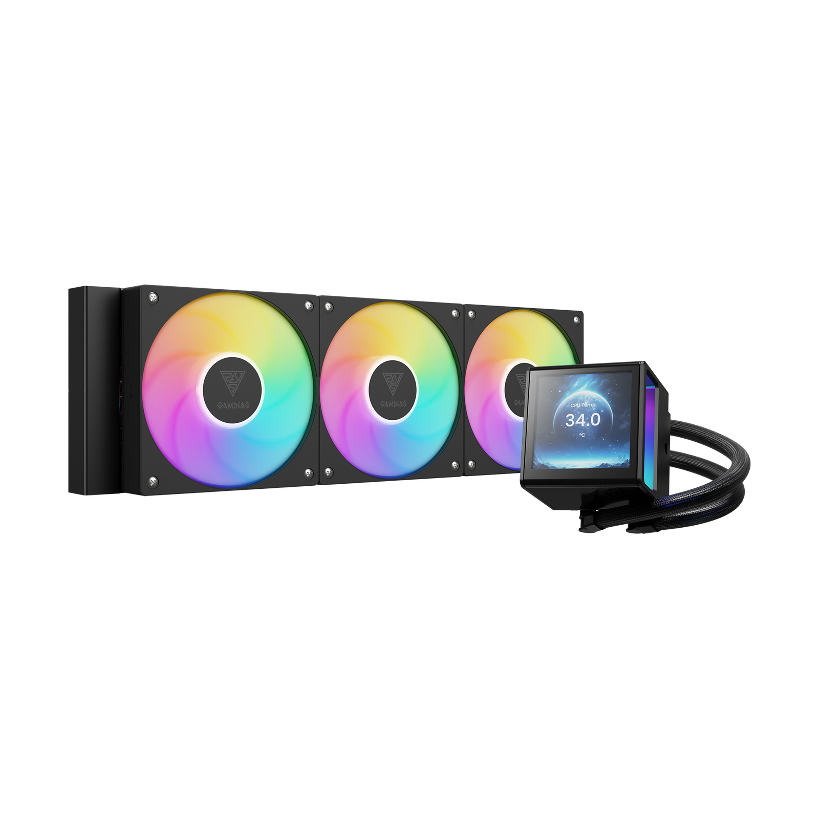 The CHIONE P5-360 liquid cooler features a customizable 3.4″ IPS LCD display for real-time information, pictures and animated GIFs. Paired with a powerful 360mm radiator and three 120mm ARGB PWM fans, it delivers top-tier cooling performance, ensuring your system stays cool and fashion.