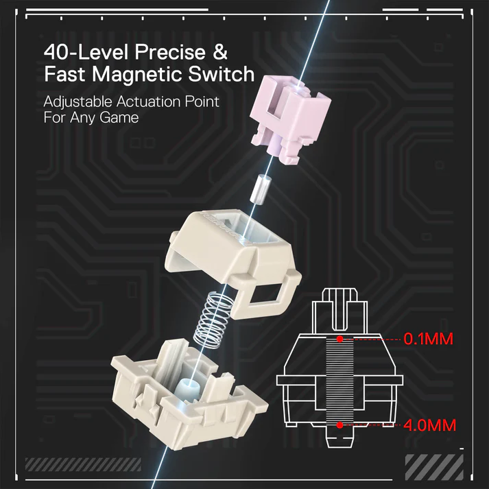 Exploded View of Redragon K617 Magnetic Switch, Showing Adjustable 0.1mm to 4.0mm Actuation Distance for Customizable Keystrokes