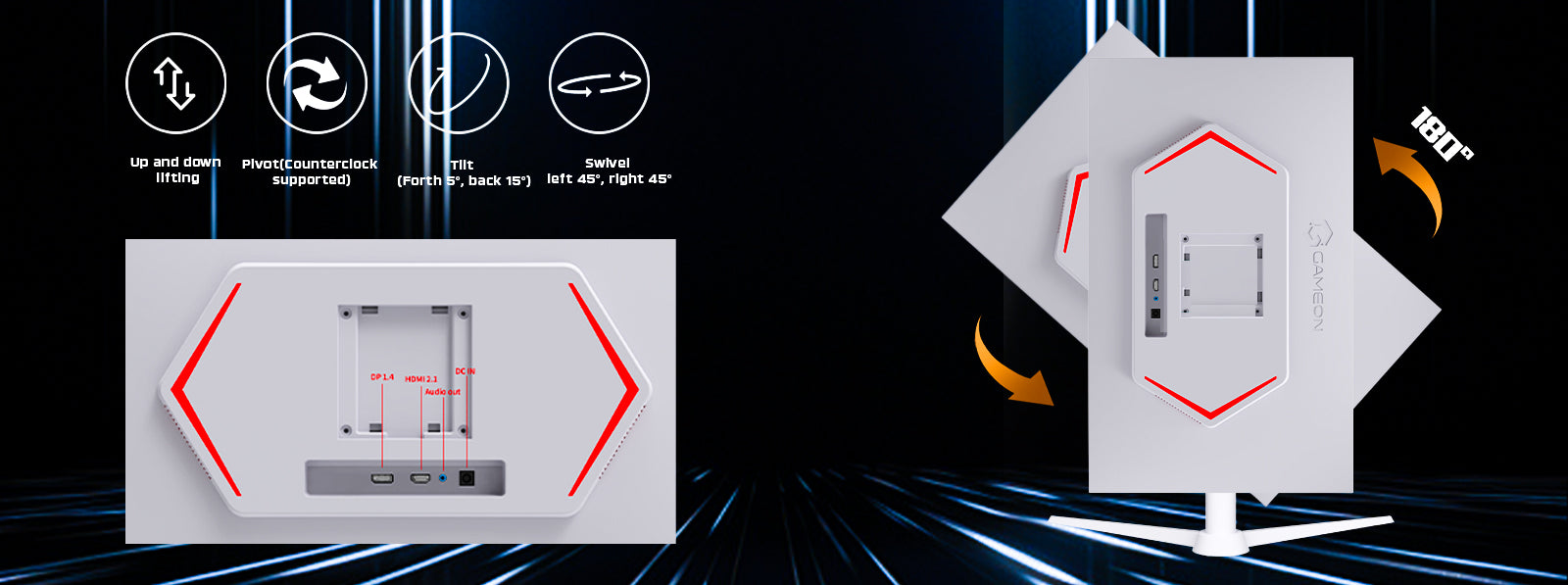 • I/O Ports: HDMI 2.1, DP 1.4, Audio Out, and DC 2.1 input