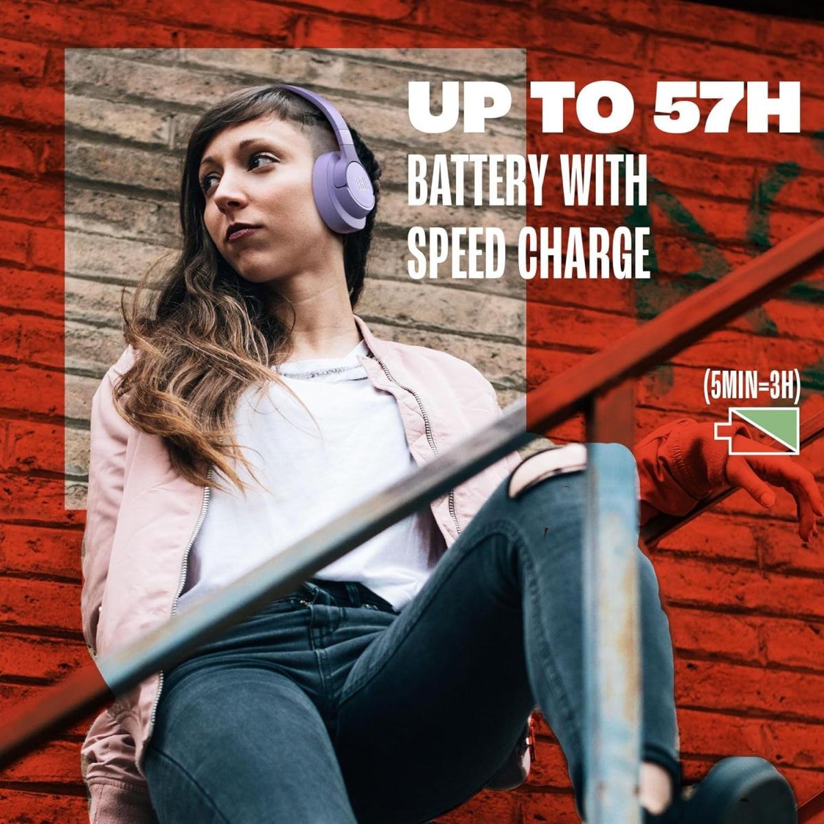 The JBL Tune 720BT headphones stream powerful JBL Pure Bass sound for up to 76 hours, thanks to the latest 5.3 BT technology. Quickly rechargeable, they sit comfortably on your head even after hours of listening pleasure. With a flat-folding design, the JBL Tune 720BT easily fits in your backpack to follow you everywhere.