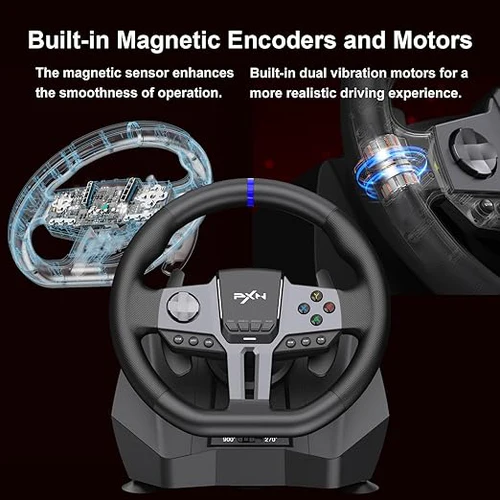 Experience realistic racing with the PXN V9 Gen2 multi-platform steering wheel. Built with high-quality ABS materials, dual vibration motors, and 270°/900° rotation, it delivers true-to-life driving. Featuring a 6-in-1 shifter, dual-mode pedals (clutch, brake, accelerator), and secure table mounting, it’s perfect for racing and truck simulators. Compatible with PC, PS4, Xbox One/Series X|S, and Switch for a wide range of racing titles.