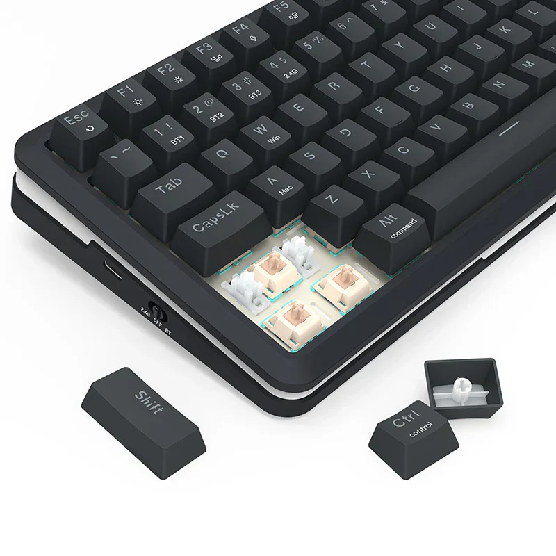 Type-C wired, Bluetooth (3.0+5.0) and 2.4GHz available. Easily connect to devices within 10 meters seamlessly, and easily switch between three modes (buttons on the left side of the keyboard) to achieve efficient multitasking.